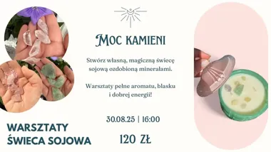 W Inowrocławiu organizowane są kameralne warsztaty ręcznego wykonania świec z wosku sojowego w eleganckich szklanych opakowaniach. Uczestniczki nauczą się procesu przygotowania świecy od podstaw, w tym osadzania dwóch knotów i dobierania drobnych minerałów zgodnie z wybraną intencją (np. spokój, miłość, energia lub ochrona). Wydarzenie ma formę spotkania dla kobiet, łączącego praktyczną naukę i towarzyską atmosferę; nie jest wymagane wcześniejsze doświadczenie.